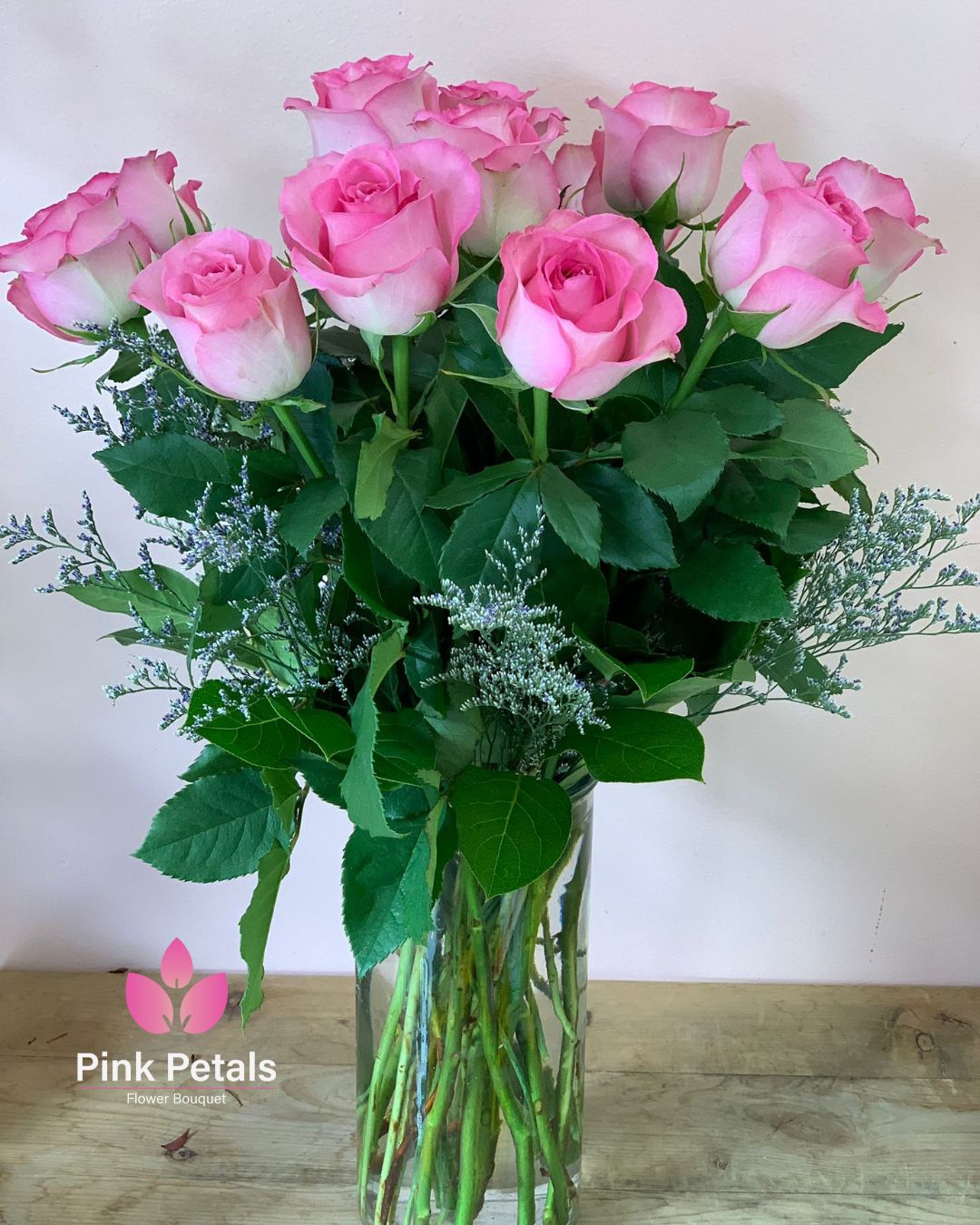 10 PINK ROSES WITH LIMONIUM FILLERS IN GLASS VASE